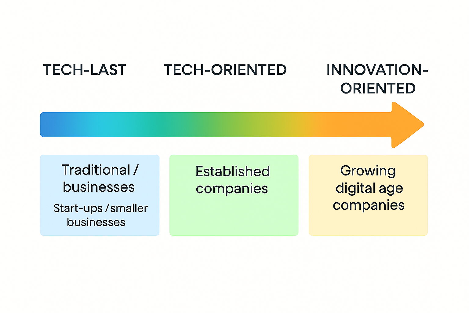 In today’s rapidly evolving business landscape, organisations can be broadly positioned along a spectrum that reflects their relationship with technology and innovation. This image captures that continuum—from legacy-driven inertia to agile, innovation-first mindsets.
